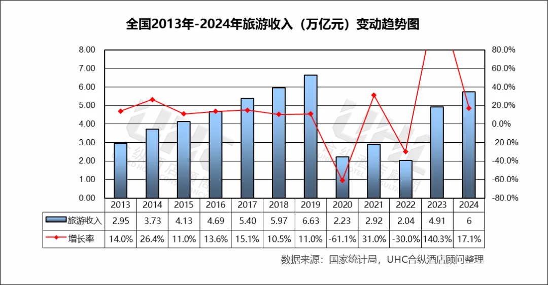 2013–2019年旅游收入从 2.95 万亿元增长至 6.63 万亿元,年均增速超过10%,反映出城镇化、消费升级和交通基础设施投入的显著拉动。2020 年出现断崖式下跌增速降为-61.1%,为十年最大降幅。2023 年强势反弹(+40.3%),为恢复周期的拐点。2024 年进一步增长至 6 万亿元,逼近甚至略超 2019年的水平。