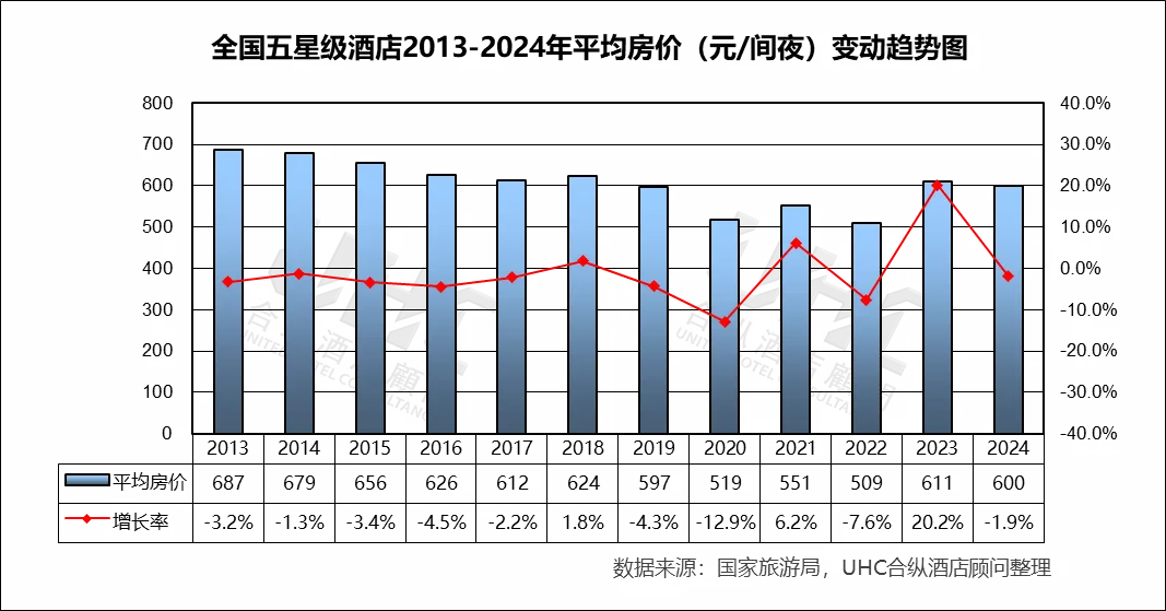 全国五星级酒店2013-2024年的平均房价为606元,其中最高为2013年的687元,最低为2022年的509元。从变动趋势来看,2013–2019 年呈现温和递减,反映供给扩张、商务市场竞争加剧以及部分城市高星酒店价格体系趋于理性;2020 年疫情冲击显著; 2021–2023 年房价逐步回升至 611 元,2023 年反弹显著(+20.2%),得益于强劲的国内文旅需求恢复与度假型五星酒店的价格拉动;2024 年在需求回归平稳后,价格趋向理性,特别是部分商务类酒店涨幅受限。