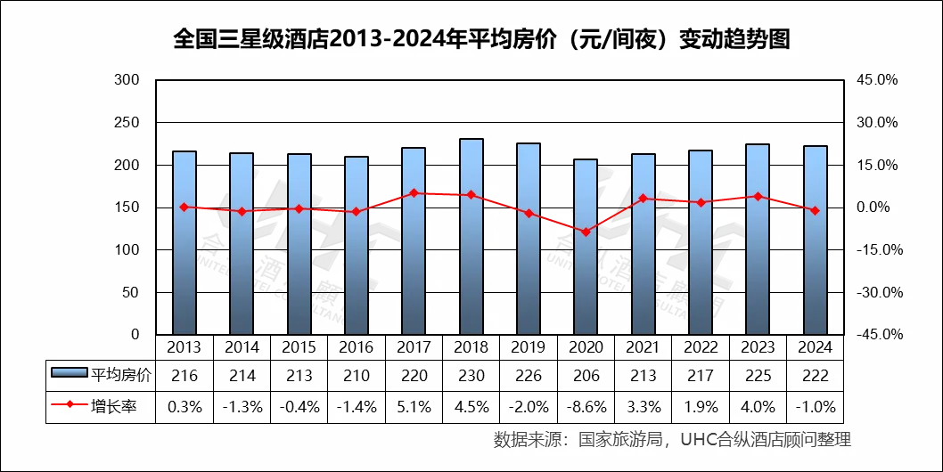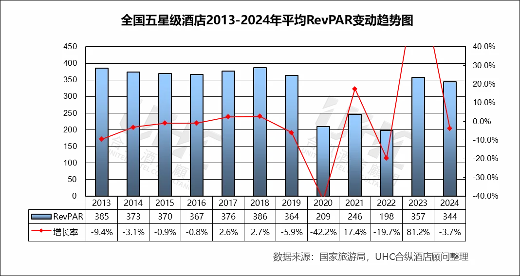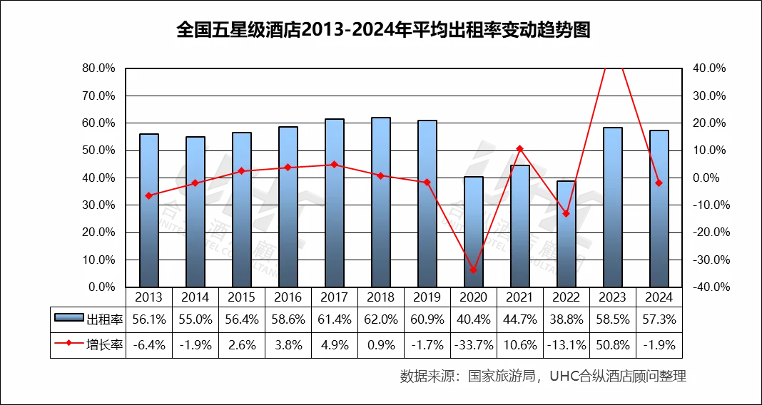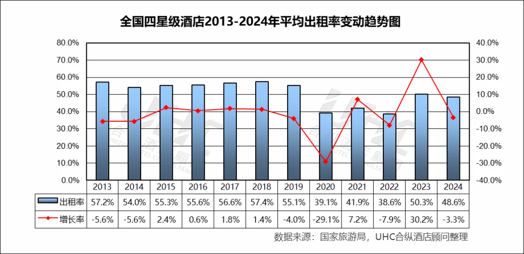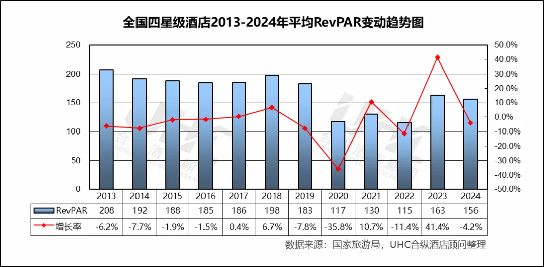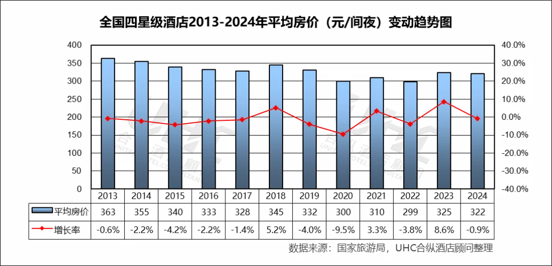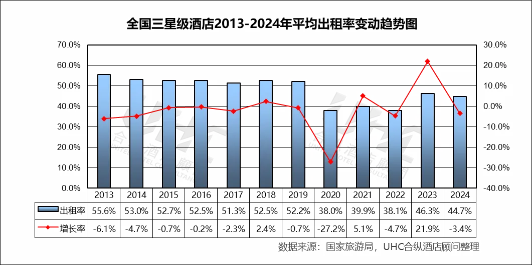 出租率方面,2013-2024年的平均出租率为54.2%,其中最高为2018年的62%,最低为2022年的38.8%。从变动趋势来看,2013–2019 年稳步上升出租率从 56.1% 提升至 62.0%(2018 为峰值),反映经济增长、商旅需求扩张和供需结构相对平衡;2020 年受疫情冲击,出租率仅 40.4%(–33.6%),为历史最低;2023 年出现“强效反弹”,2024 年小幅回落出租率下降至 57.3%(–1.9%),反映旅游需求恢复正常化后,供给端新增项目与老旧酒店的竞争加剧。