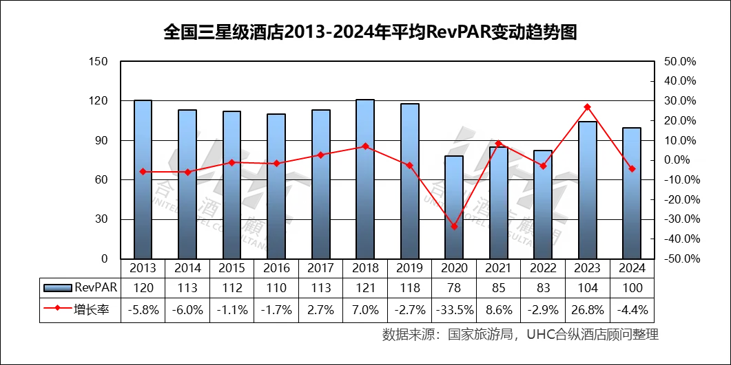 RevPAR方面,2013-2024年的平均RevPAR为105元,其中最高为2018年的121元,最低为2020年的78元。从变动态势来看,2013–2019年行业整体表现稳健,增长率波动幅度较小(-6.0%至7.0%),说明市场处于成熟期,供需相对平衡;2020年RevPAR骤降至78元,同比暴跌33.5%,直接体现新冠疫情对酒店业的毁灭性冲击;2021–2022年虽略有回升,但仍显著低于疫情前水平,反映行业复苏缓慢;2023年RevPAR大幅反弹至104元(+26.8%),受益于疫情管控放开后的报复性出行需求;2024年小幅回落至100元(-4.4%),可能反映需求回归理性、市场竞争加剧或成本上升压力。