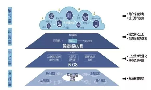 COSMOPlat平台共分为四层:第一层是资源层,开放聚合全球资源,实现各类资源的分布式调度和最优匹配。第二层是平台层,支持工业应用的快速开发、部署、运行、集成,实现工业技术软件化。第三层是应用层,为企业提供具体互联工厂应用服务,形成全流程的应用解决方案。第四层是模式层,依托互联工厂应用服务实现模式创新和资源共享。