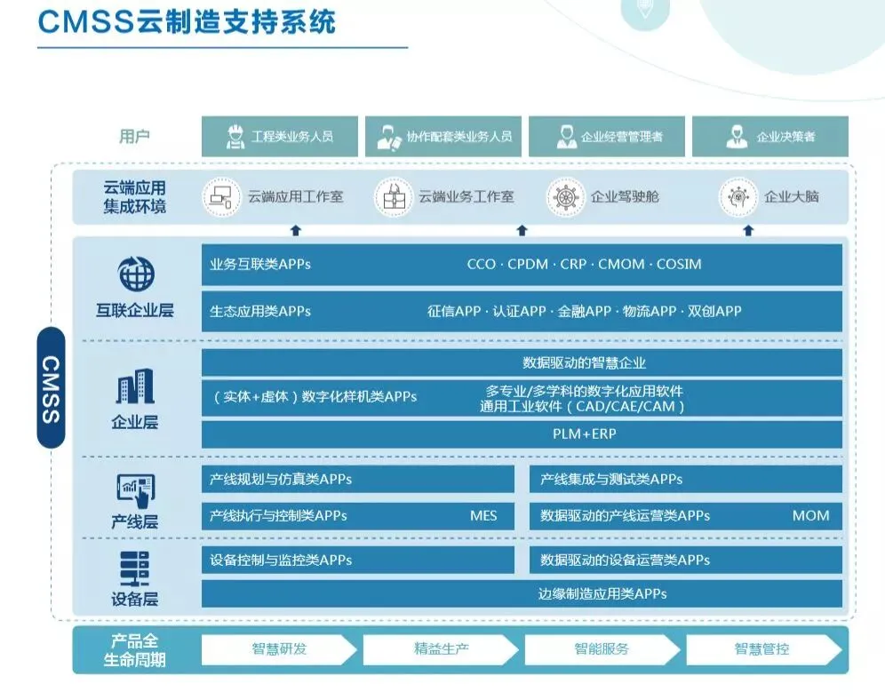 CMSS云制造支持系统主要包括工业品营销与采购全流程服务支持系统、制造能力与生产性服务外协与协外全流程服务支持系统、企业间协同制造全流程支持系统、项目级和企业级智能制造全流程支持系统等四个方面,采用“一脑一舱两室两站一淘金”的系统级工业应用为用户提供服务,满足各类企业深度参与云制造产业集群生态建设的现实需求。