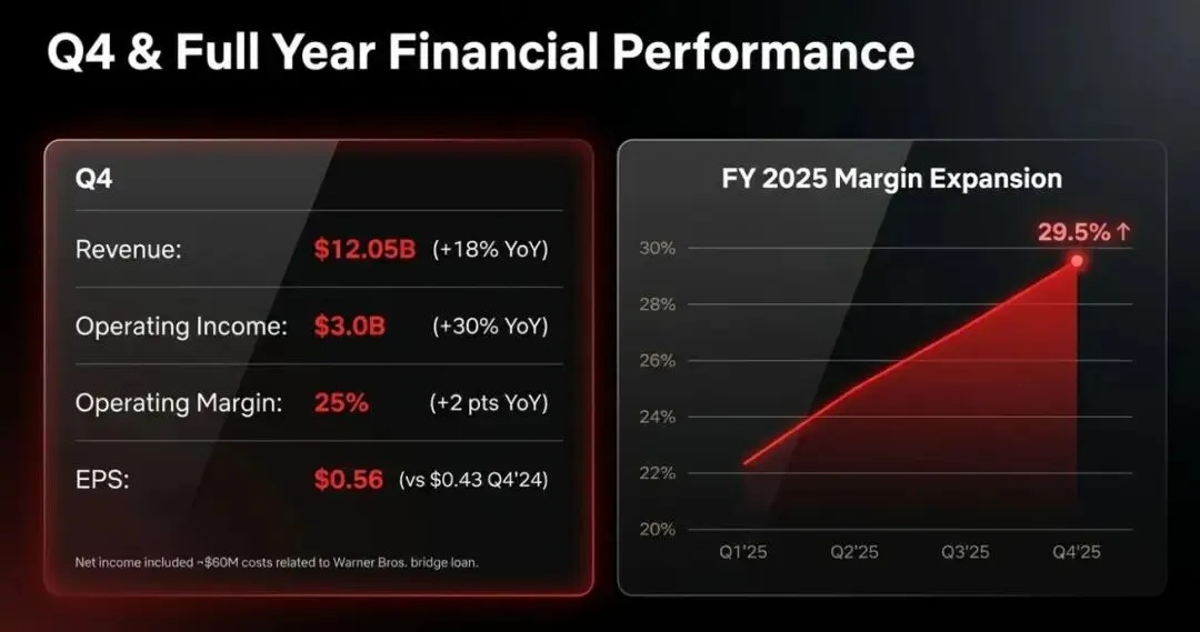 奈飞公布了2025年第四季度及全年财务业绩。这份财报呈现出鲜明的“双面性”:一方面,Q4核心财务数据全面优于市场预期,全球订阅用户突破3.25亿大关,验证了其业务基本盘的稳健性;另一方面,2026年一季度及全年业绩指引普遍低于华尔街预期,叠加为收购华纳兄弟暂停股票回购的决定,直接引发股价盘后跳水,跌幅一度超5%,跌至去年4月以来的低位区间。
