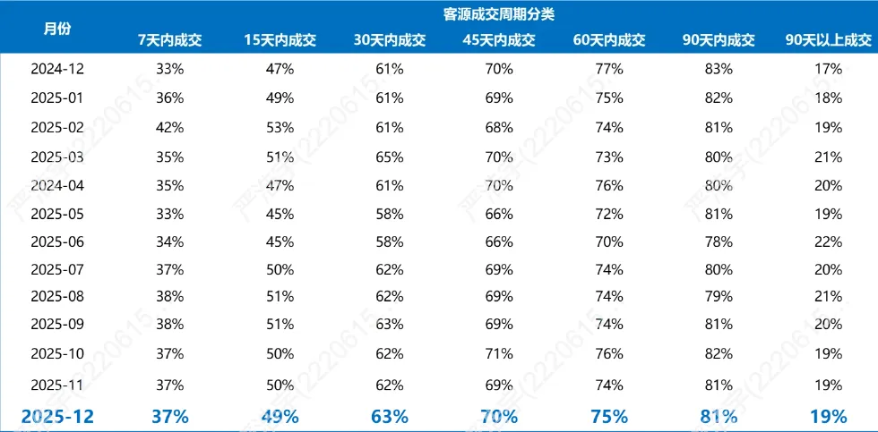 客源平均周期42.5天;成交周期加速,60天以上成交占比提升,超8成客户可在90内成交;整体来看,市场信心在逐渐恢复。12月房源平均周期90.6天,60天内成交占比提升,超8成房源可在挂牌180天内成交。