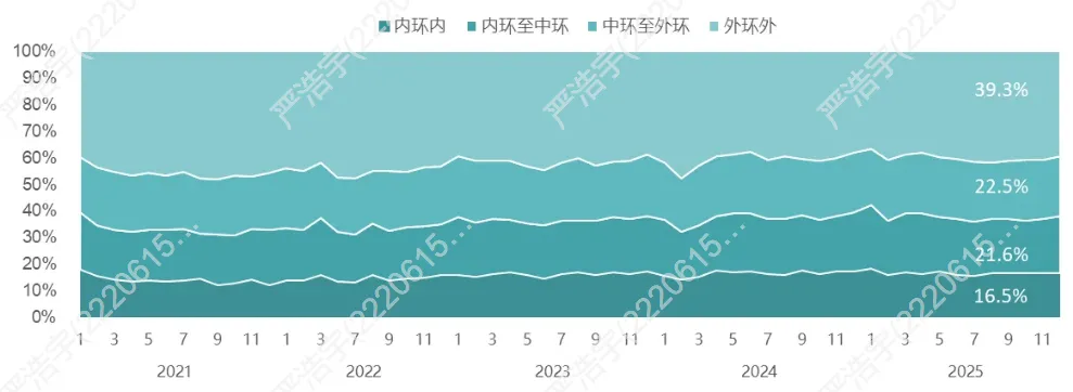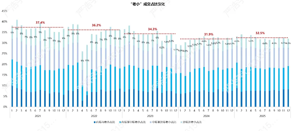 “老小”成交情况:当前政策环境下,内环内“老小”优势释放,成交占比较前期明显提升,外环外“老小”去化占比降低,去化压力较大。(备注:“老小”房源限定为小于70平米且楼龄大于20年的房源)