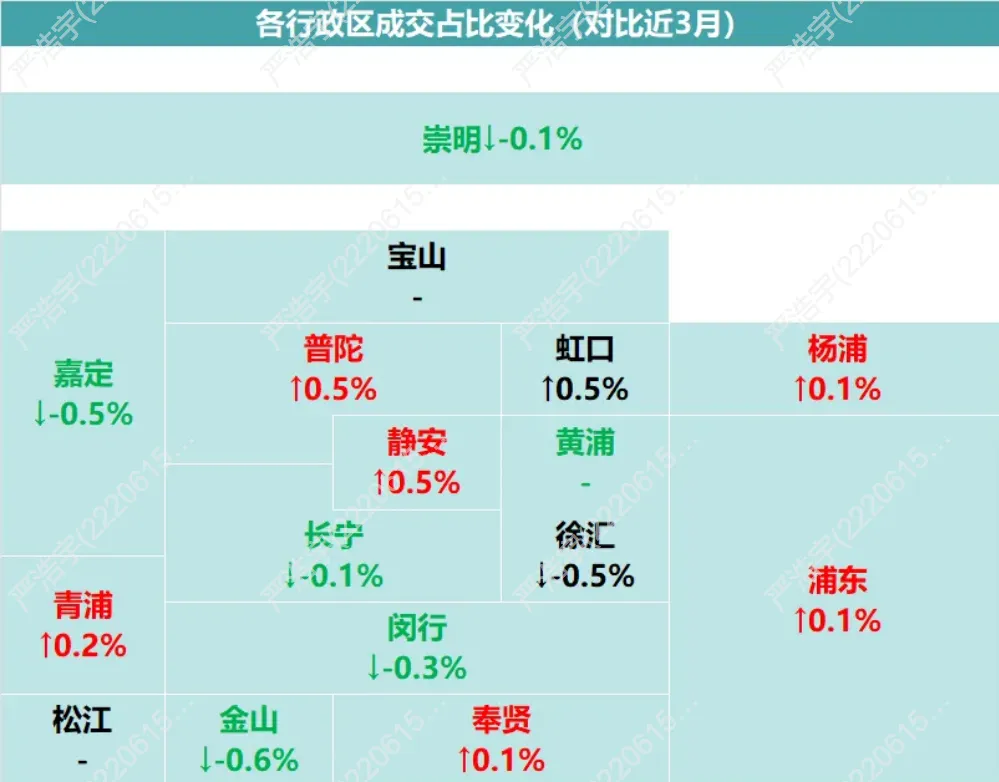 从行政区来看,和近三月相比,静安、静安、普陀等中心城区,成交占比上升明显。
