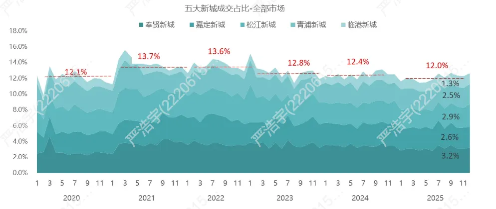 12月五大新城成交占比回升,为近2年五大新城成交占比最高水平,刚性需求的持续释放及外环外不限套数的相关政策支持,为区域交易提供了坚实支撑。