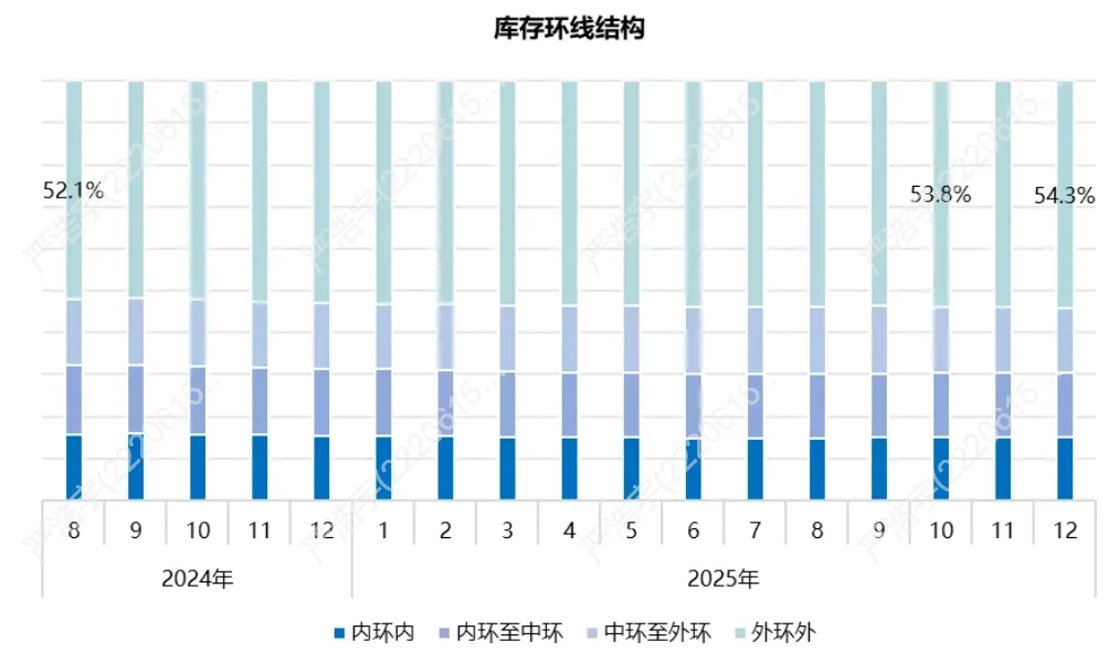 成交量企稳,供应端挂牌热情下降,库存连续多月下滑,12月库存量128367套;外环外库存占比高企,政策刺激下,外环外去化压力仍然较大。