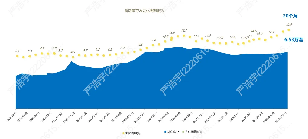 新房库存总量6.53万套,总量提升,去化周期提升至20个月,达历史高位。(备注:新房去化周期=新房库存/近6个月月度平均成交套数)