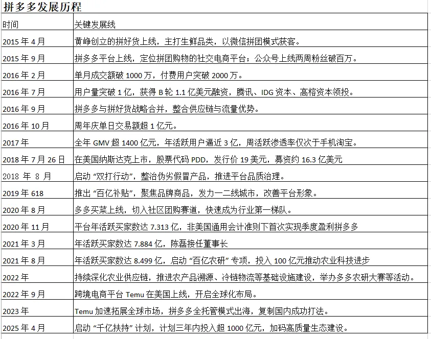 PDD自 2015 年创立至今,经历了社交裂变起步、上市扩张、品质升级与生态深化、全球化布局等阶段,以下是其关键发展时间线: