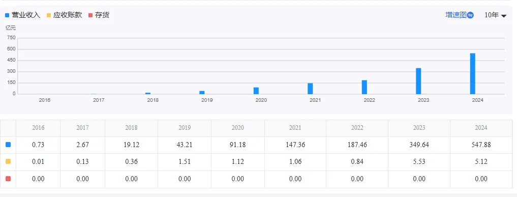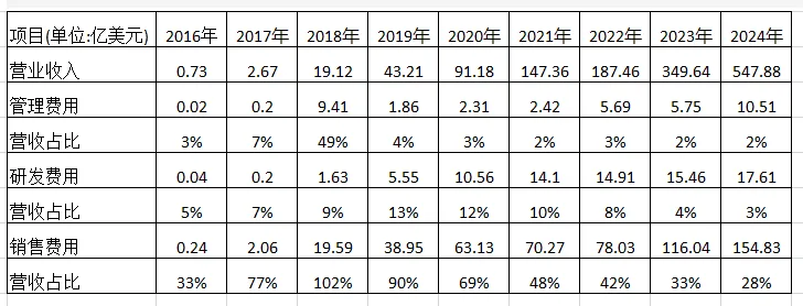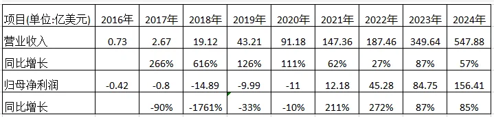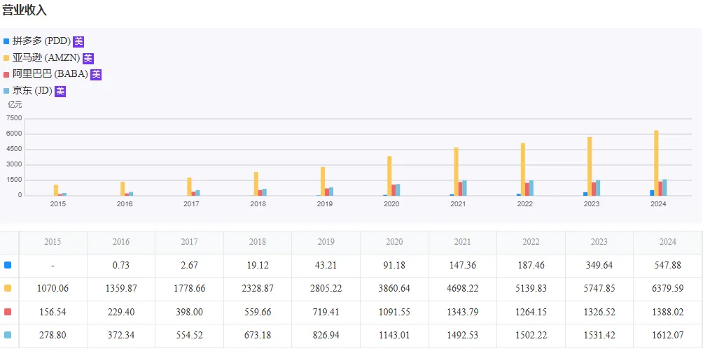 看多多近10年的营收增幅真是强劲,除了2022年,其他年份增幅大于50%,营收从2016年的0.73亿美元到2024年的547亿美元。