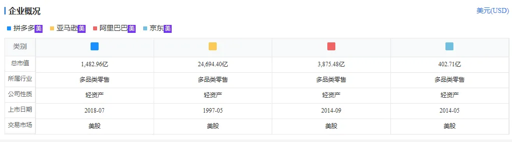 从营收对比来看,多多的营收是目前最小的,但其毛利率和净利率却是最高的。京东的营收是多多的三倍,而多多的净利润却是京东的三倍,阿里的营收是多多的两倍有余,净利润却只比多多高25亿美元,以目前的增速完全有可能1年后反超。亚马逊的营收和利润都是最强的,以亚马逊的营收和利润做标杆,我们国内的这几家企业还是有很大的空间。