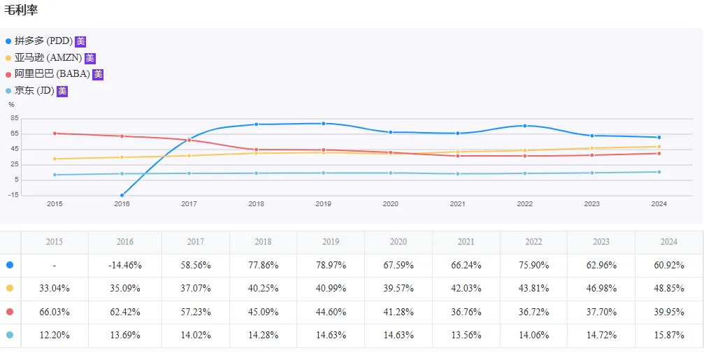 与这份业绩形成鲜明反差的是其估值表现:截至 2024 年末,拼多多美股总市值约 1347 亿美元(折合人民币约 1 万亿元),对应市盈率仅 10 倍左右,远低于其高速增长期的估值水平,甚至已与阿里等传统电商平台接近。这种 “业绩高增、估值低企” 的背离,核心源于市场对两大潜在风险的深度担忧。