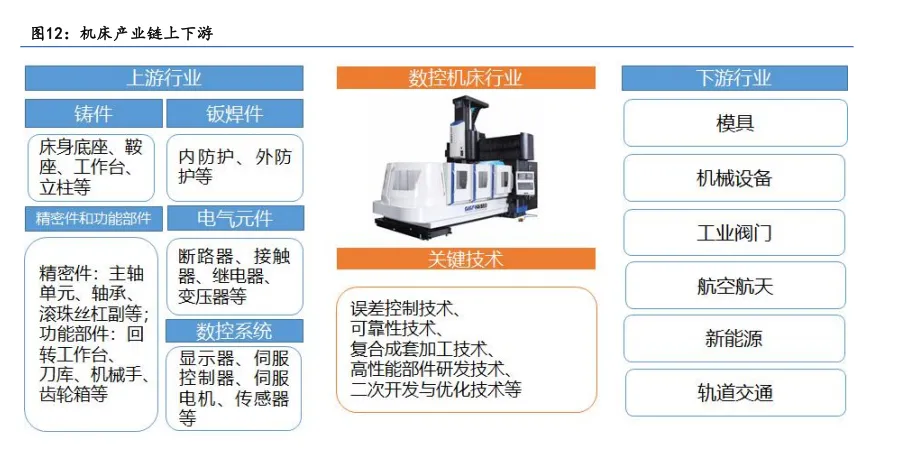 数控机床产业链的上游包括铸件、钣焊件、精密件和功能部件、数控系统和电气元件。产业链中游包括前文提到的各类不同功能及结构的数控机床以及加工中心,下游应用于制造领域各个行业的终端用户。数控机床关键的功能部件包括:结构件、控制系统、驱动系统、传动系统、刀库、刀塔及组件、光栅尺等。