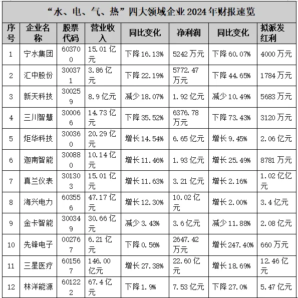 2024年度,在政策利好、行业向“新”发展、公司加速“出海”等推动下,“水、电、气、热”领域不少企业经营业绩表现亮眼。这不仅包括新市场的拓展和新业务的开发,还包括扩大生产规模、提高生产效率或进行技术创新,增加产出和市场竞争力,从而实现业绩提升,以及通过优化成本结构、提高运营效率和管理效益,降低成本并提升盈利能力,从而实现业绩增长。