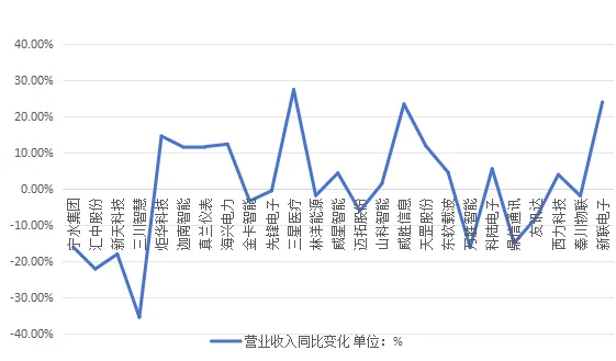 从营业收入同比变化来看,25家企业中有13家实现了增长,其中增长最多的为三星医疗达27.38%,其次为新联电子达23.94%,威胜信息达23.35%。12家营收出现了下滑,其中下滑最多的为三川智慧达35.52%,其次为汇中股份达18.07%,新天科技达18.07%。这些企业在公告中表示,营业收入下滑主要是由市场竞争加剧以及原材料成本上涨所致。