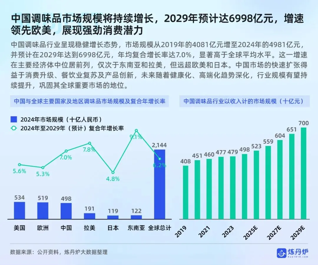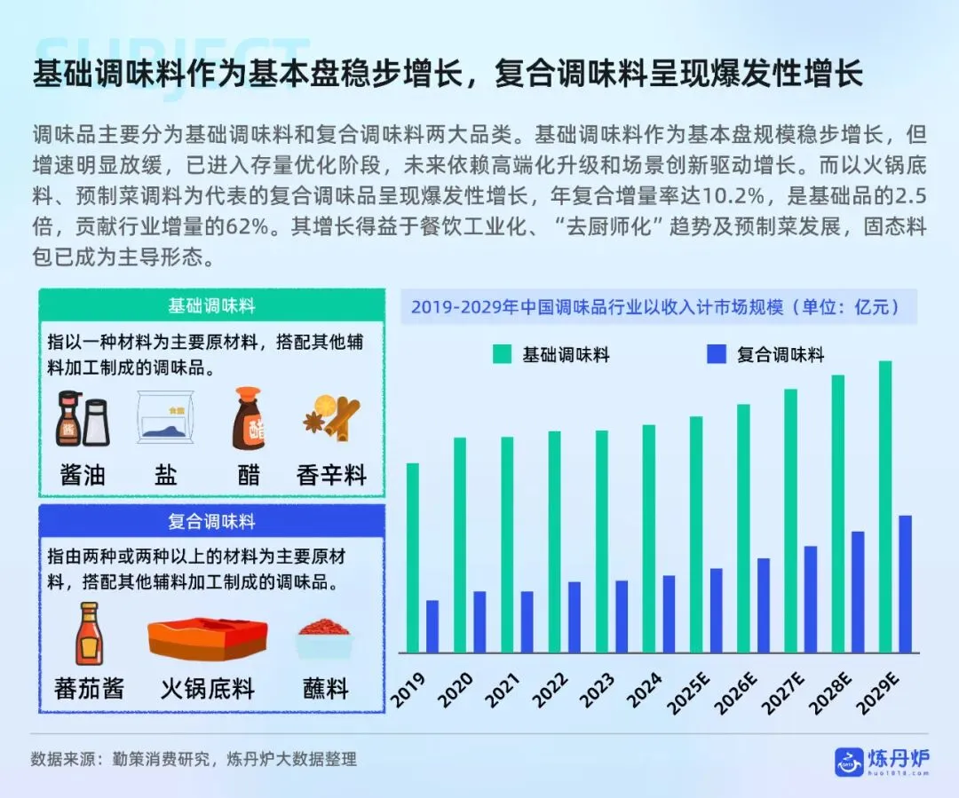 中国调味品市场规模持续增长,预计到2029年将达到6998亿元,年均复合增长率达7.0%。市场分为基础调味料和复合调味料两大品类,其中复合调味料呈现爆发性增长,年复合增长率达10.2%,成为行业增长的主要驱动力。
