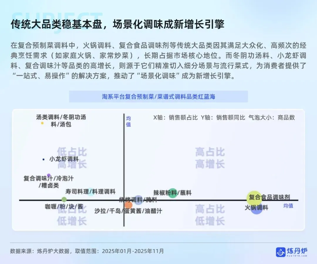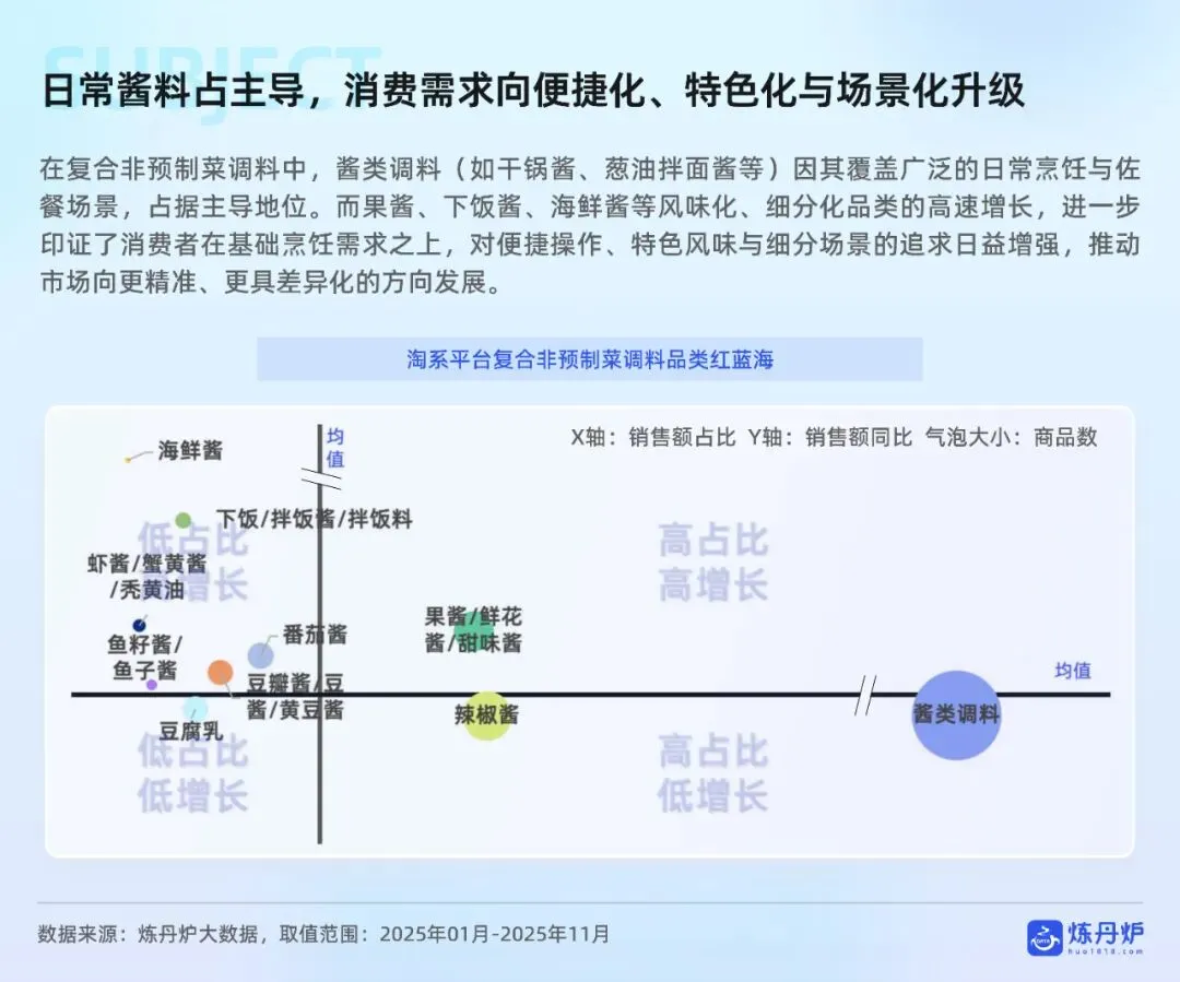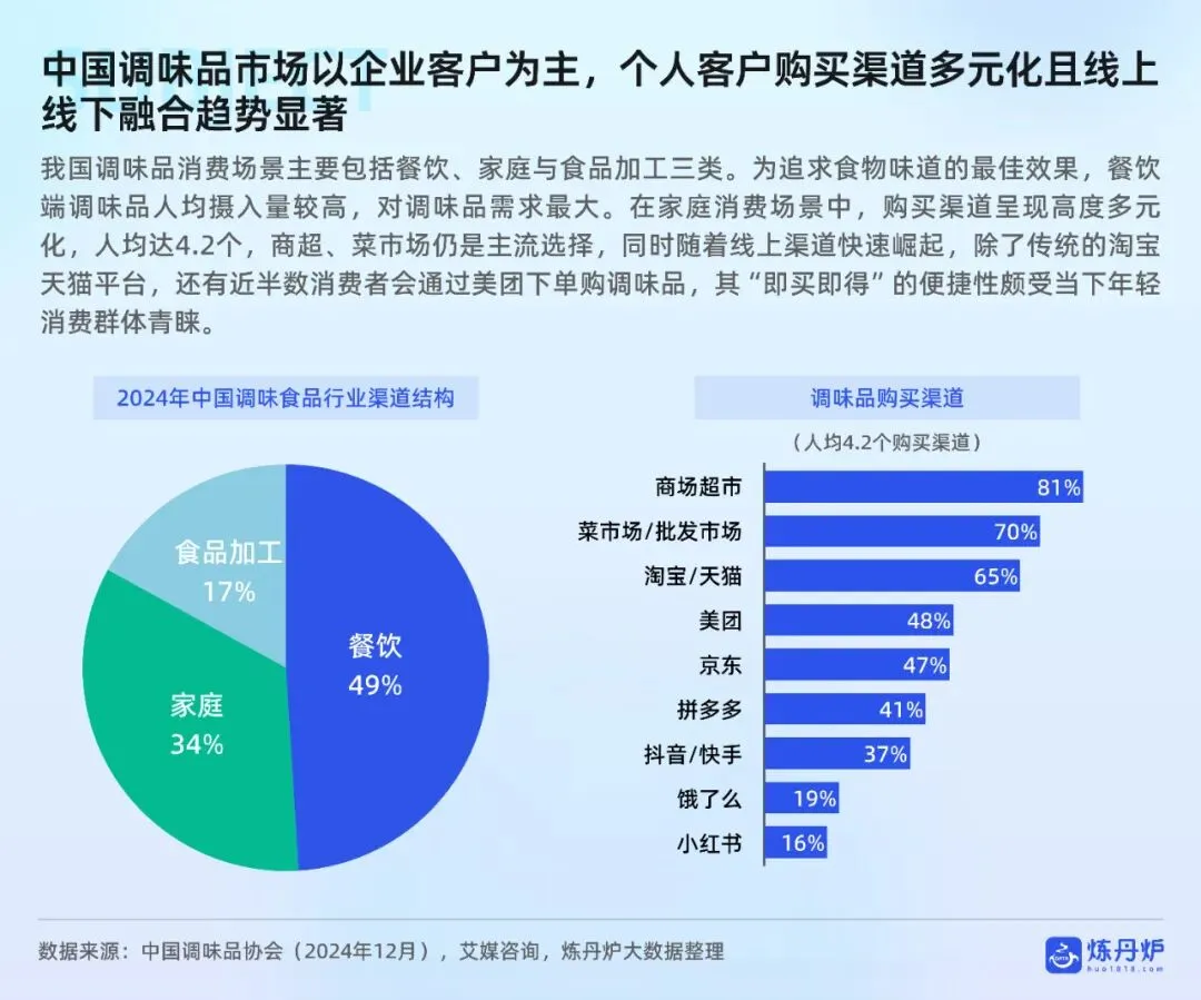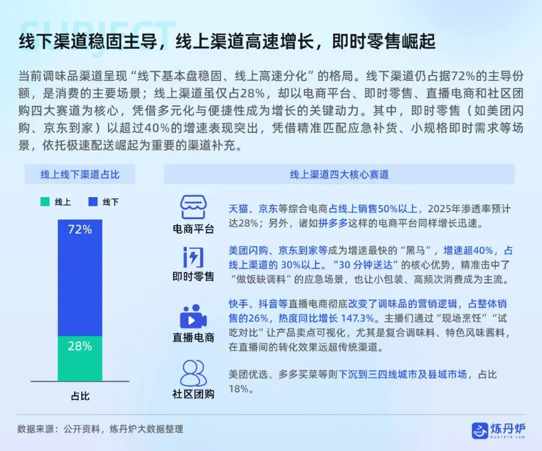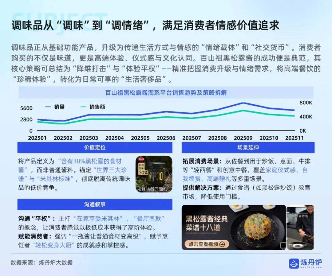 销售渠道方面,线下渠道仍占主导,但线上渠道高速增长,即时零售、直播电商等新兴模式表现突出。消费者购买动机方面,便捷性是复合调味品的核心驱动力,而口味、品质和性价比是基础调味品的关键考量因素。报告还指出,调味品正从基础功能产品升级为传递生活方式与情感的“情绪载体”,如百山祖黑松露酱通过高端定位和场景拓展,满足消费者对仪式感和文化认同的需求。