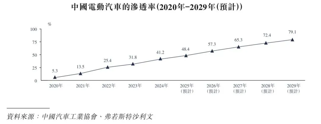 2024年,中国电动汽车产量达到12,888.0千辆。预测显示,中国电动汽车产量将于2029年增至30,621.6千辆,2025至2029年的复合年增长率达15.6%。中国电动汽车渗透率预计将由2024年的41.2%跃升至2029年的79.1%,凸显中国市场的庞大潜力与强劲增长轨迹。此强劲扩张得益于各地区政府推出的购车补贴与税收优惠等支持性政策,有效加速了电动汽车普及进程。电池技术的进步显著提升了车辆续航里程并缩短充电时间。此外,技术进步与规模经济所带来的成本下降,加上充电基础设施的持续完善,进一步提升消费者接受度并增强使用便利性。