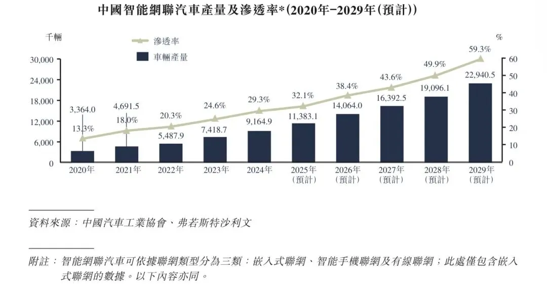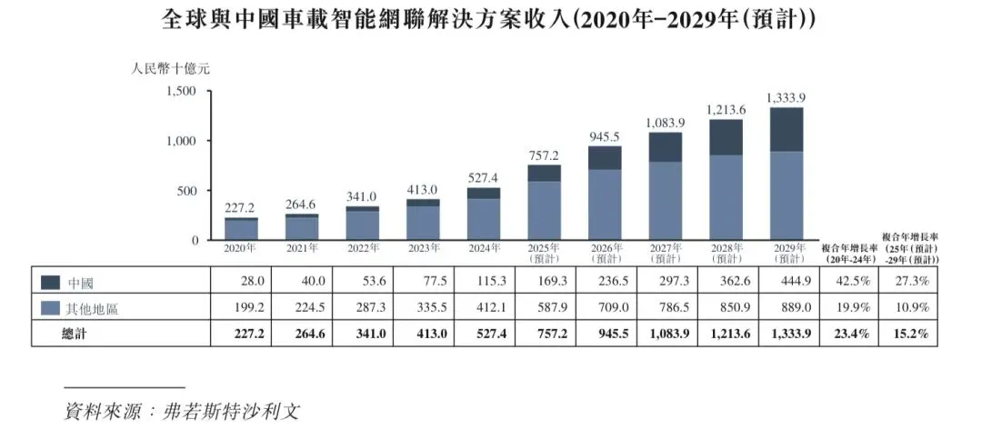 车载智能网联解决方案通常由硬件、软件及服务三部分构成。硬件层面主要包含通讯模块、车载联网控制单元及其他硬件设备,软件层面则涵盖车载网络平台及其他有关服务。随着智能网联汽车产量持续增长,全球及中国车载智能网联解决方案的市场规模正不断扩大,预计将由2024年的人民币5,274亿元及人民币1,153亿元增长至2029年的人民币13,339亿元及人民币4,449亿元。