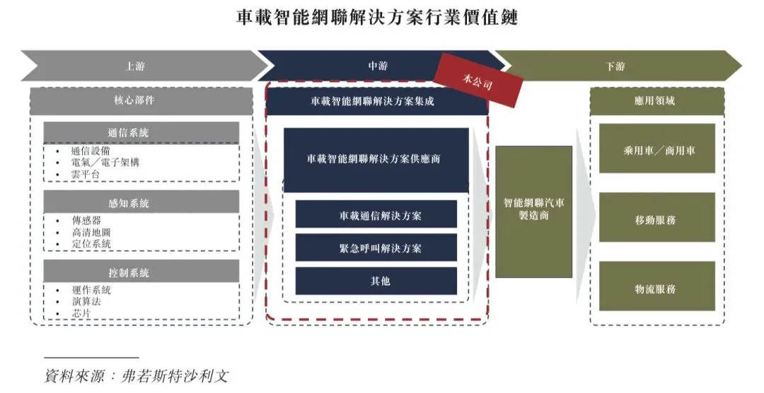 车载智能网联解决方案价值链具有高度跨领域特性,相关参与者涵盖硬件、软件、服务及基础设施等领域。上游供应商提供通讯、感知、决策与执行所需的核心硬件及软件。中游环节以车载智能网联解决方案集成为核心。车载智能网联解决方案供应商主要为智能网联汽车制造商提供车载通信解决方案、紧急呼叫解决方案等方案,助力制造商生产具备智能功能的汽车。而该产业的应用领域主要涵盖乘用车╱商用车、移动服务及物流服务三大板块。