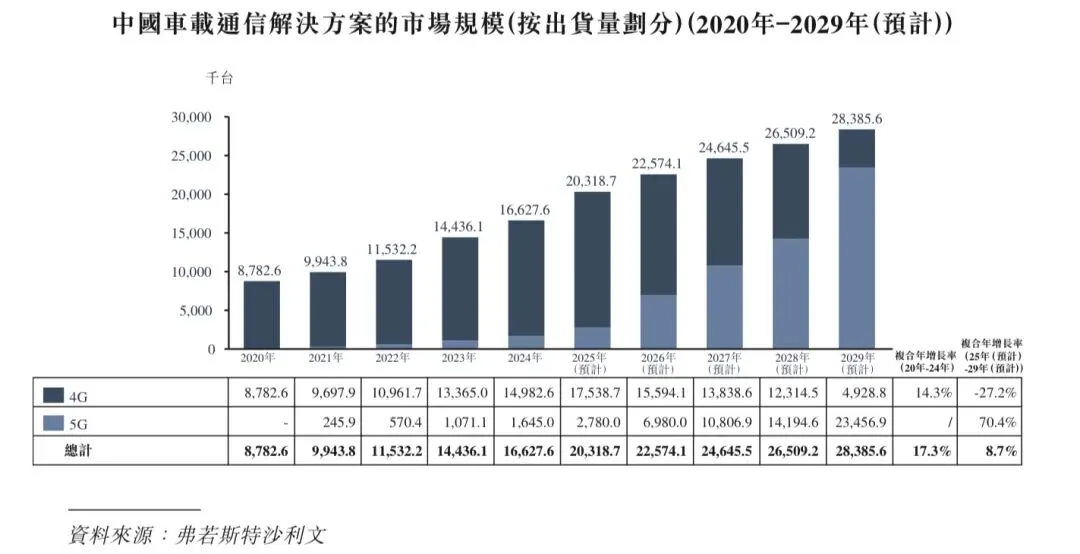 车载通信解决方案构成了实现电车安全、自动化及强化使用者体验的核心技术体系。随着电动化、自动驾驶与车联网需求同步上升,车载运算平台、通讯模块、传感器与云端服务的整合深度持续深化,带动相关产品需求稳步增长。全球与中国市场的出货量已连续数年稳健上升,预计将使行业需求维持持续上扬态势。全球与中国出货量因此连续数年扩增 – 从2020年的38,730.3千台及8,782.6千台增长至2024年的70,328.7千台及16,627.6千台,预计2025至2029年间将分别以6.0%及8.7%的复合年增长率持续增加,至2029年将达103,354.2千台及28,385.6千台。该发展轨迹凸显了产业链上下游对高效能运算、低延迟互联及安全可靠软件平台的依赖,同时也反映出政策推动与消费者对智能汽车需求所带来的同步效益。