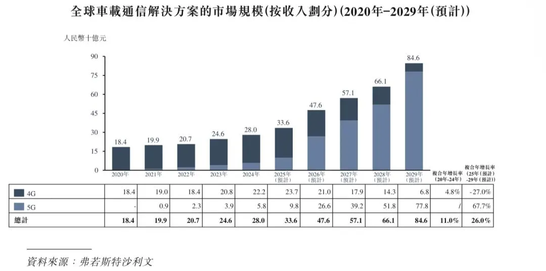 由于5G车载通信模块所需的硬件与技术更为复杂,其单价高于4G替代方案。因此,尽管4G解决方案在出货量方面仍占主导地位,但5G产品较高的售价缩小了两大产品线之间的收入差距。于2024年,就收入而言,全球与中国车载通信解决方案的市场规模分别为人民币280亿元及人民币65亿元。目前,5G解决方案部署的核心驱动力是先进智能驾驶系统对高带宽及超低延迟的严苛需求,因此尚未成为主流配置。于预测期内,由于成本及技术成熟度的差异,预计4G与5G将并存发展。