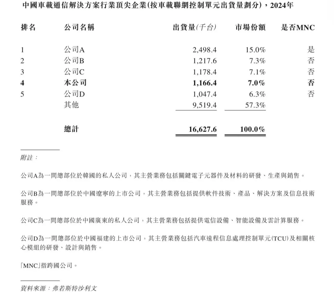 于2024年,以车载联网控制单元出货量计,云动智能在中国车载通信解决方案行业的所有供应商中排名第四,在国产供应商中排名第三。