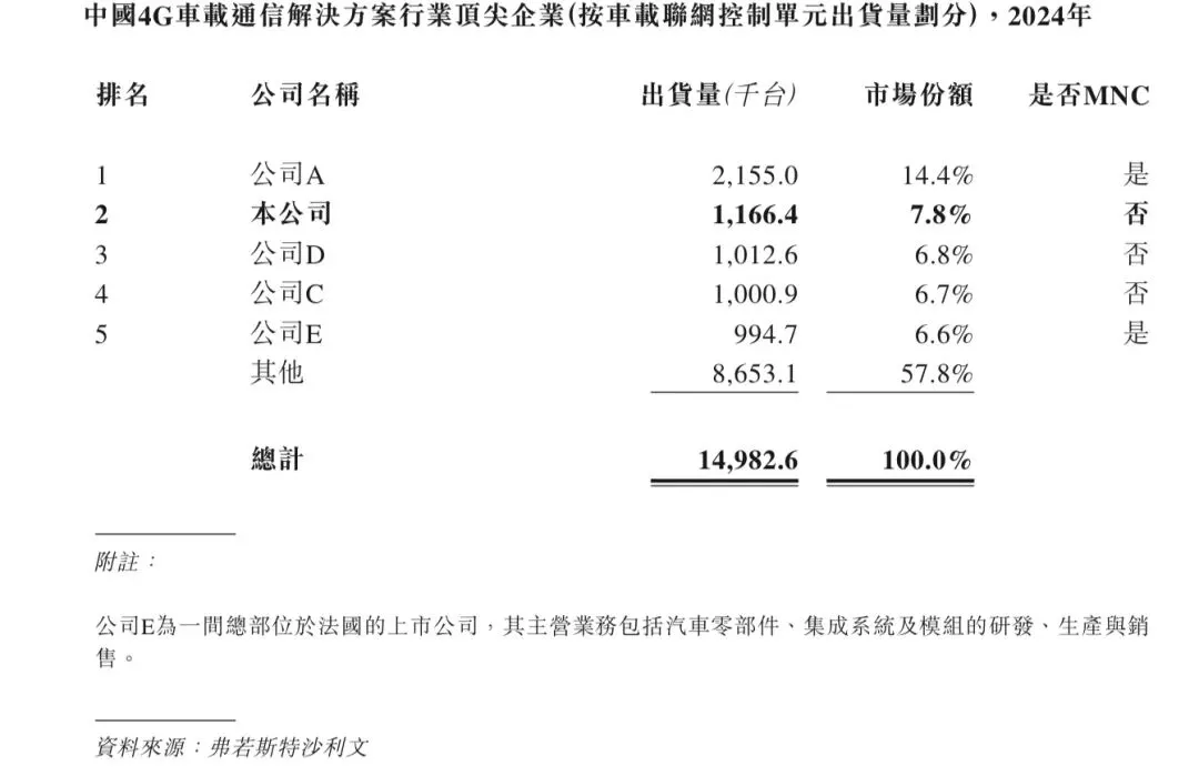 于2024年,按4G车载联网控制单元出货量计,车载通信解决方案市场前五大厂商占整个市场42.2%的份额。云动智能于所有供应商及国产供应商中分别位列第二名及第一名,出货量达1,166.4千台,占整体市场份额的7.8%。