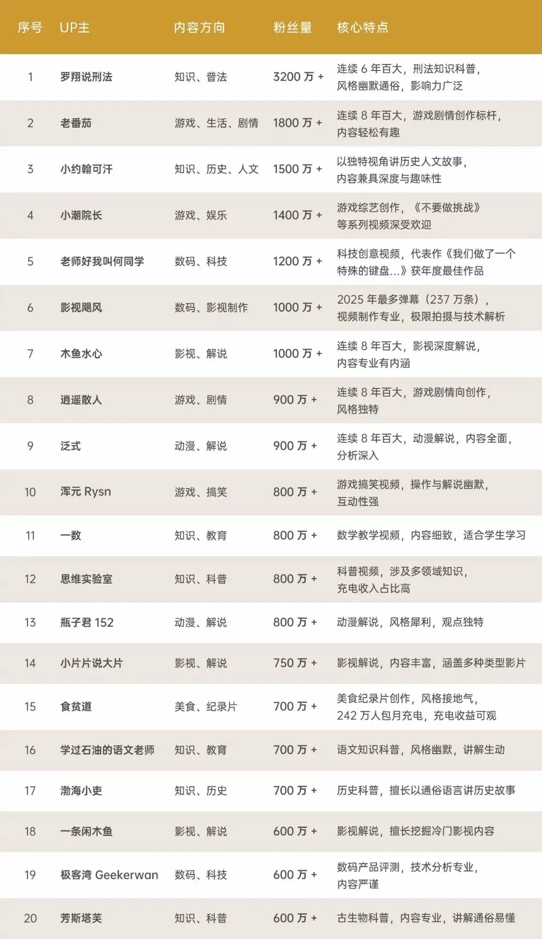 附表:B站2025年百大UP主名单(TOP20,根据B站官方榜单整理)