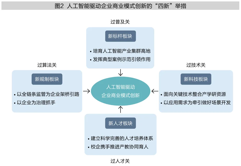 针对四大关卡,需从新标杆、新科技、新人才、新规制四个维度构建 “四新” 举措,推动人工智能与商业模式创新深度融合。