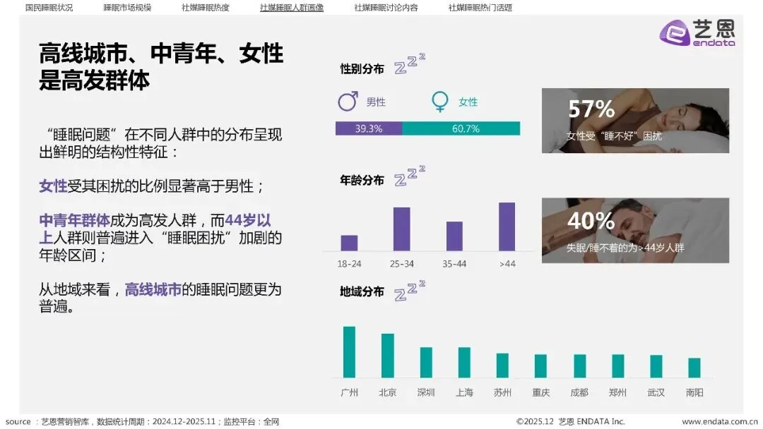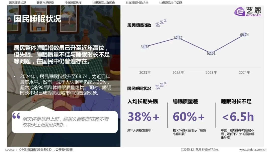 根据艺恩《2025「睡眠情况」社媒洞察报告》,一个极具张力的矛盾正在上演——尽管国民睡眠指数已回升至近四年高位,但超过30%的成年人依然深陷失眠,六成90后睡眠质量堪忧。