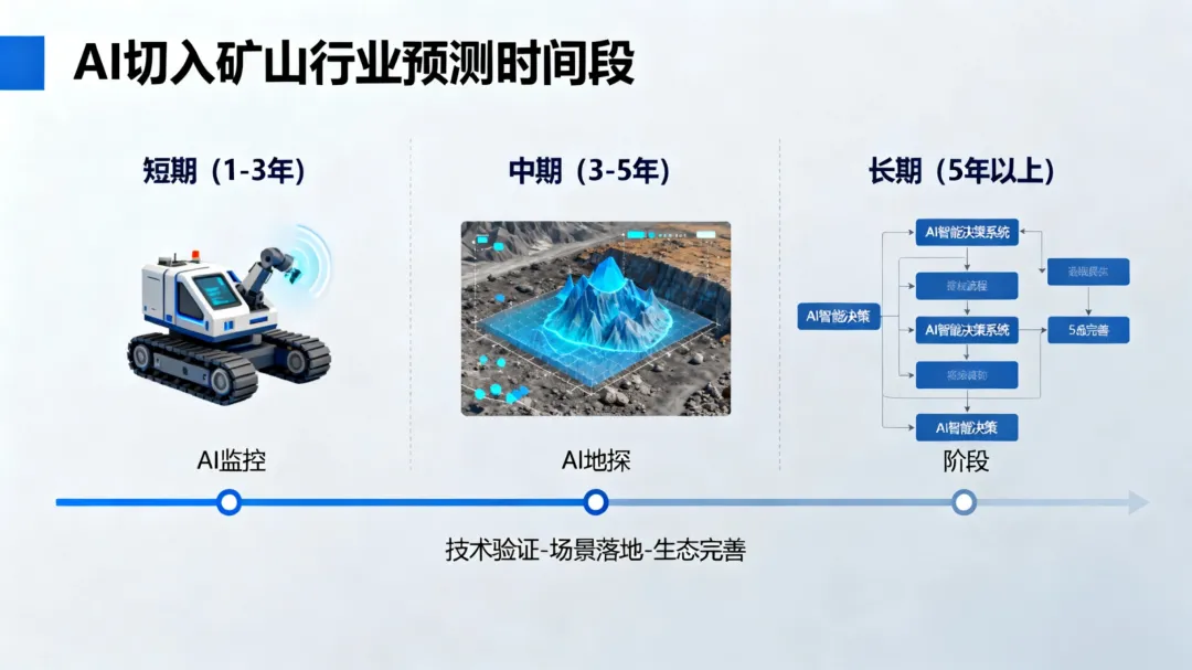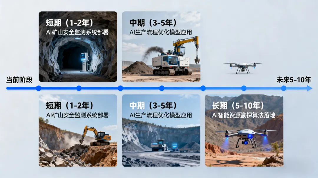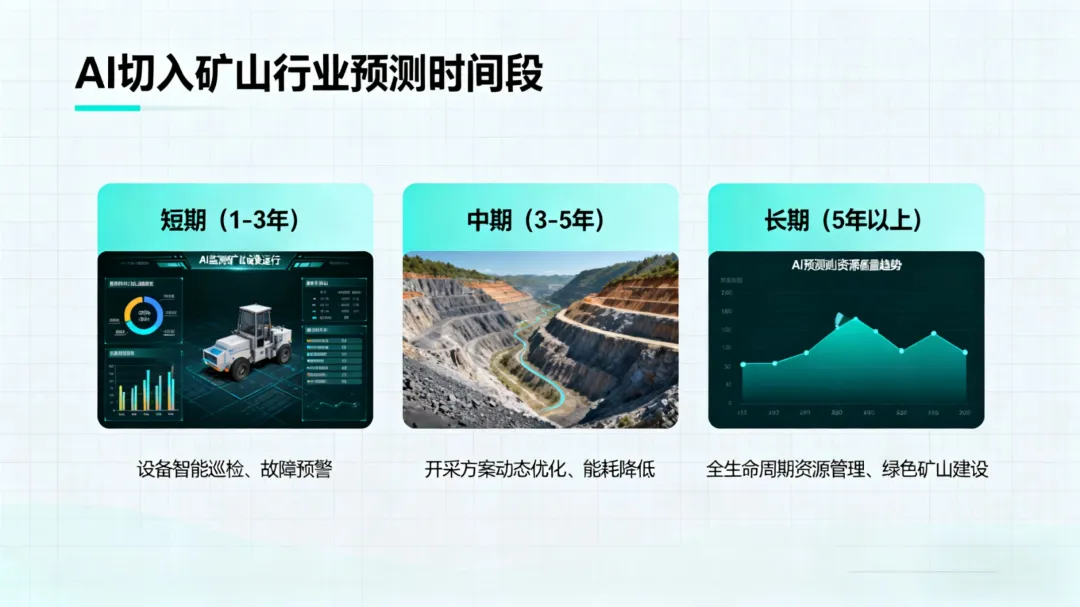 此阶段AI技术从“单点应用”转向“全链条协同”,与矿山生产、管理、环保等环节深度融合,落地率达85%以上,形成智能化管理体系。