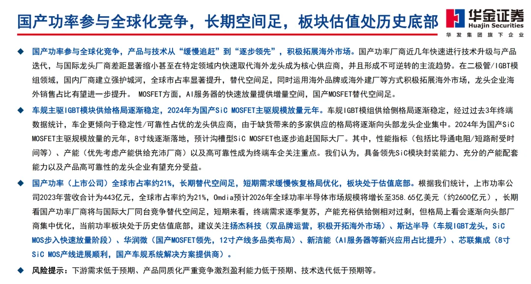 报告点名关注标的:扬杰科技(双品牌运营)、斯达半导(车规IGBT龙头)、华润微(MOSFET领先)。但小心!部分公司估值已炒高,PE(TTM)达历史高位,追涨可能套牢。