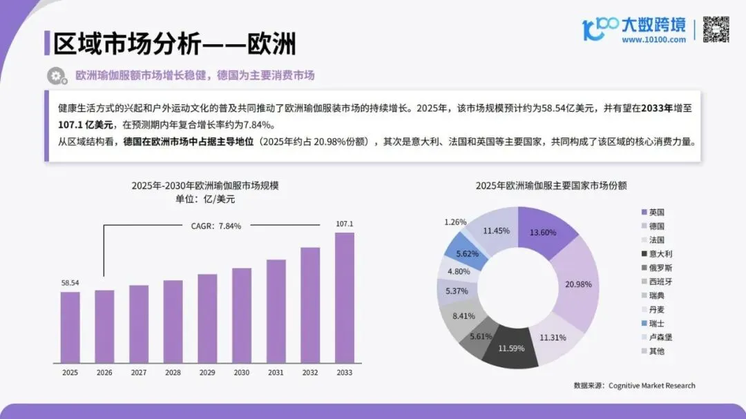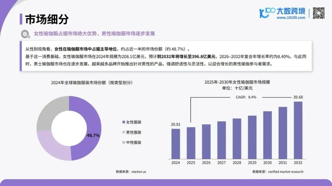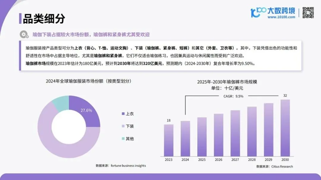 《2026全球瑜伽服市场洞察报告》由大数跨境发布,全面剖析了全球瑜伽服市场的现状、驱动因素、区域格局与未来趋势。报告指出,随着健康意识觉醒与生活方式升级,瑜伽正从小众身心练习走向普及化日常运动,推动瑜伽服从专业装备扩展为兼具功能、设计与场景适配的多元品类,市场边界正在被重新定义。