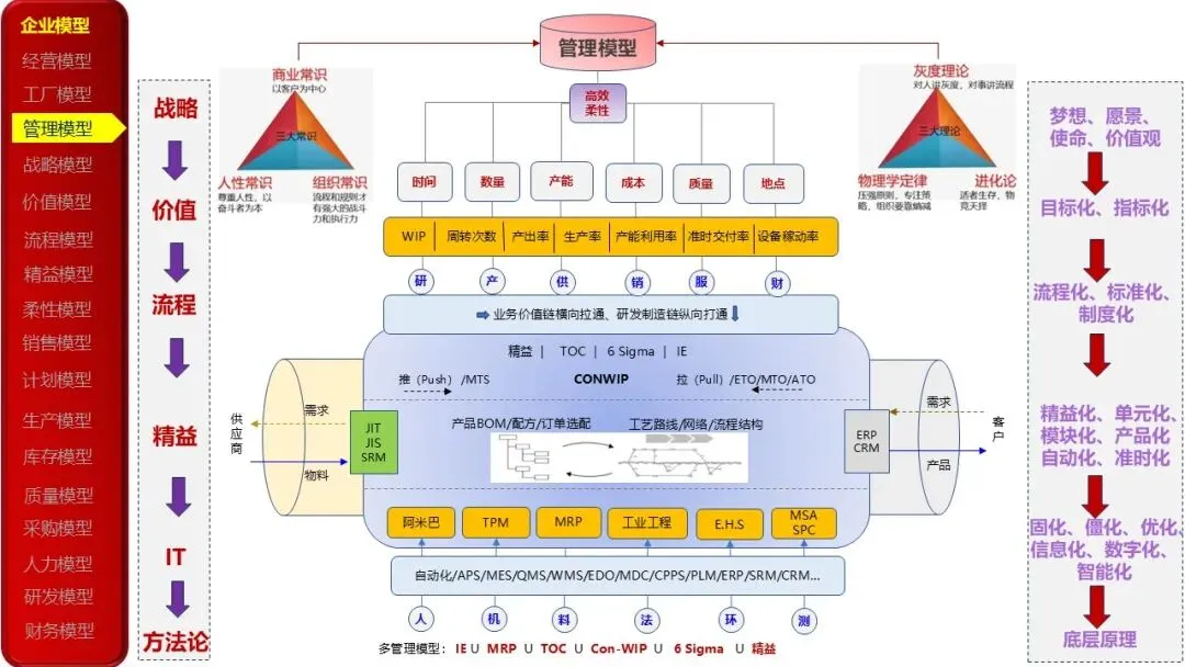 采用精益、TOC、6 Sigma、IE等管理工具,结合APS、MES、WMS、PLM、ERP等信息系统,实现管理方法与技术工具的深度融合。