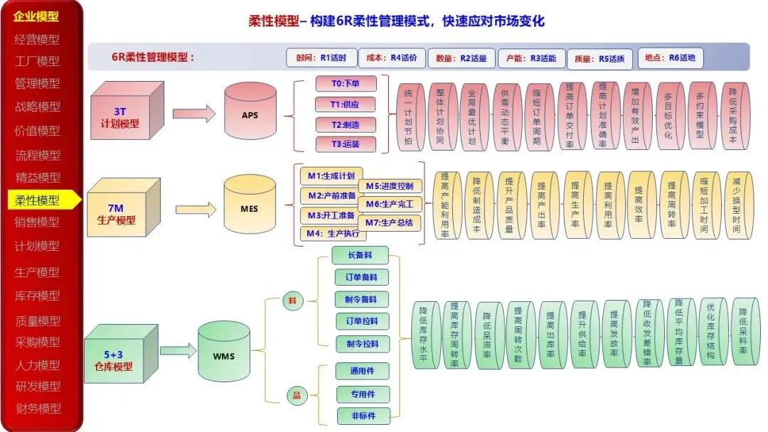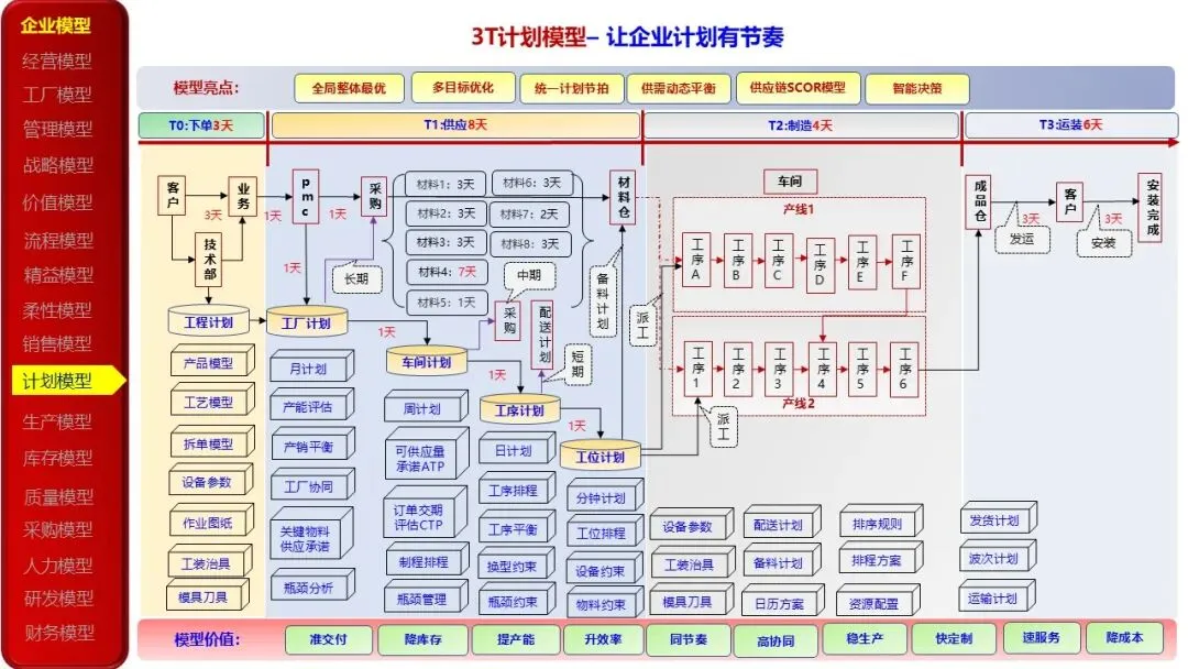 计划模型(3T)与生产模型(7M):实现四级计划协同、生产节拍统一、推拉结合、瓶颈管理,提升整体运营效率。