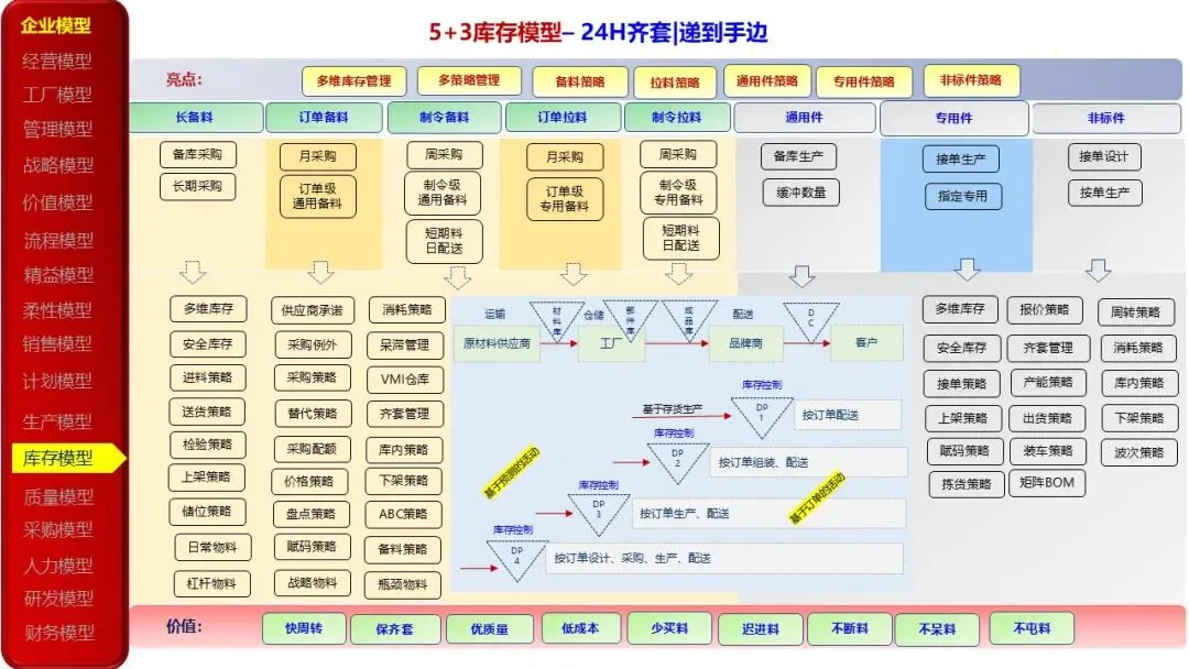 库存模型(5+3):通过多策略库存管理与齐套机制,实现“24小时齐套、递到手边”的高效物料流转。