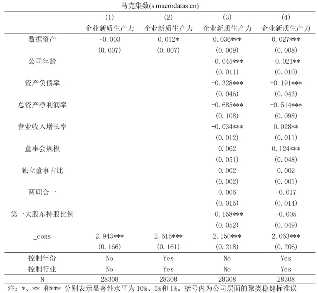 本文基于2013-2023年我国A股上市公司企业数据,考察数据资产对企业新质生产力的影响,参照《华东经济管理》武永霞(2025)的做法,对《数据资产、数字化转型与企业新质生产力》一文中的基准回归部分进行复刻