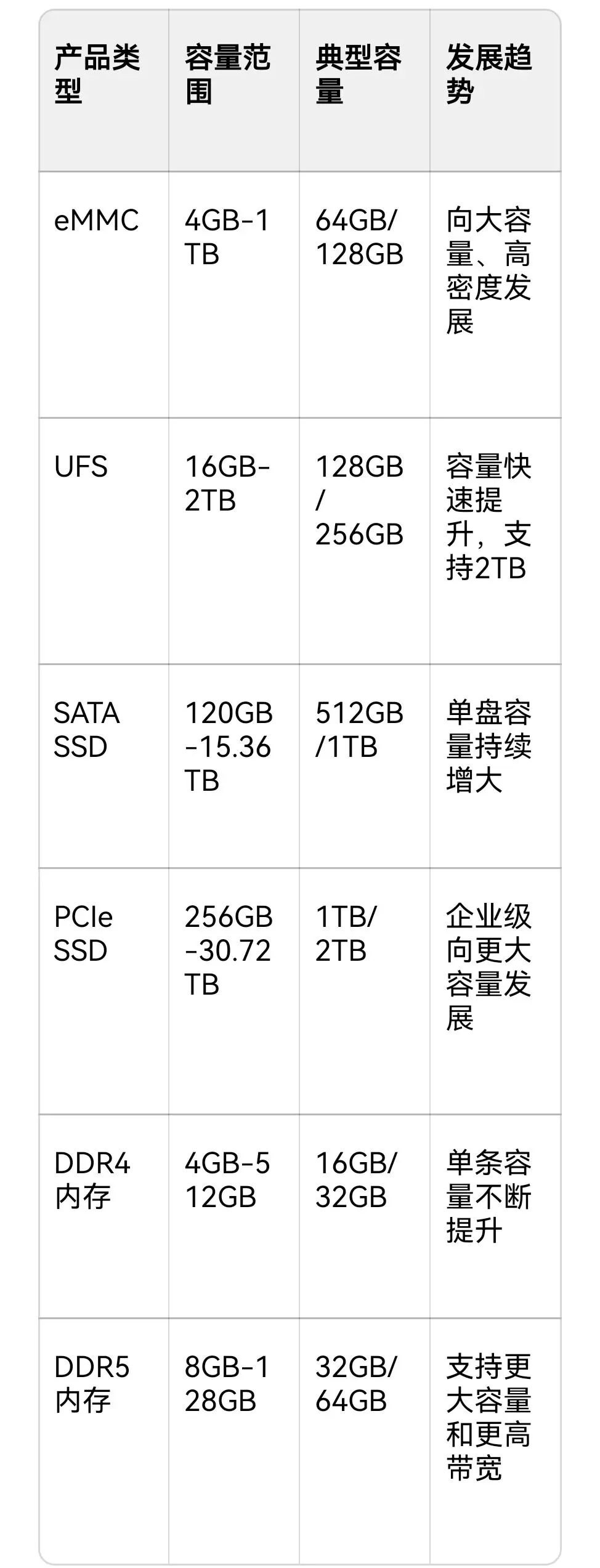 在容量方面,三大存储产品呈现出不同的发展趋势和应用特点: