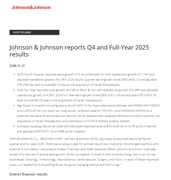 基于强生 2025Q4 及全年财报(2026 年 1 月 21 日发布)及补充信息,本文从产品线毛利、地区销售表现、毛利润波动原因三方面展开详细分析,核心数据均来自官方财报披露,部分细分领域结合业务逻辑推导。