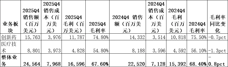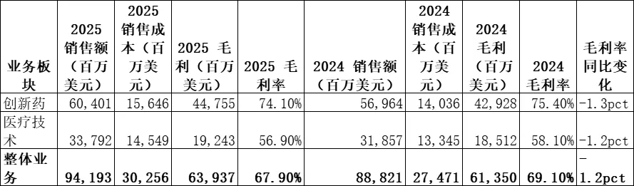 强生核心业务分为Innovative Medicine(创新药) 和MedTech(医疗技术) 两大板块,财报中未直接披露细分产品(如肿瘤药、心血管器械)的销售成本,但可通过 “板块销售额 - 板块销售成本” 计算板块级毛利及毛利率,并结合细分产品的销售表现推导对毛利的影响。
