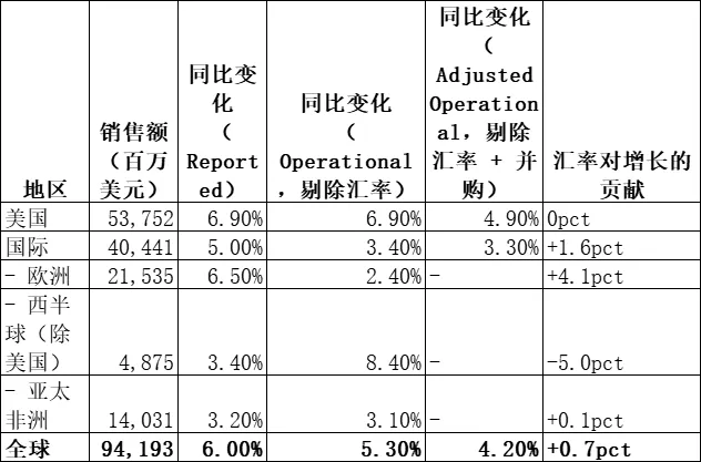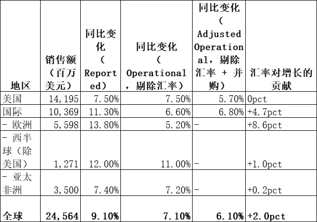 财报按 “美国 + 国际” 划分区域,国际市场进一步细分为欧洲、西半球(除美国)、亚太非洲,核心数据反映区域需求差异及汇率影响(Operational 增长剔除汇率,Adjusted Operational 增长剔除并购 / 剥离)。