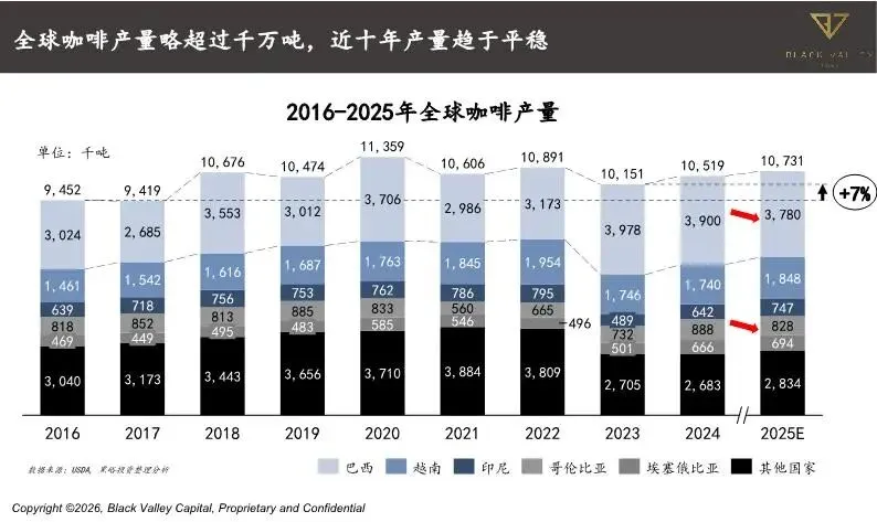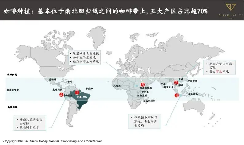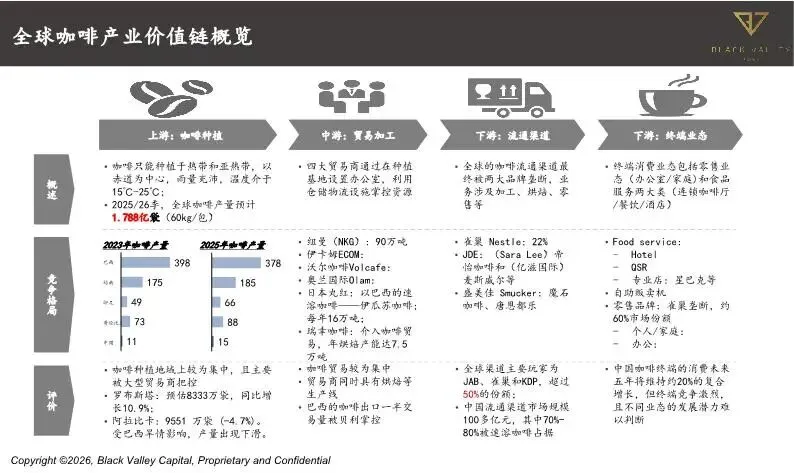 咖啡产业分为种植、加工、流通、终端消费四个环节。全球咖啡主要种在热带和亚热带地区,中国咖啡种植集中在云南,占全国产量的 98% 以上,现在正从扩大种植面积转向提升品质。
