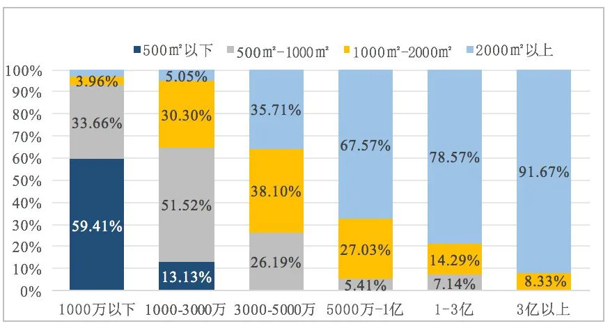 仓库使用面积与经销商的销售规模有显著关联。销售规模越大的经销商,使用仓储的面积也一般越大,年销售规模在1000万以下经销商大多使用面积在500㎡以下。销售规模在1000万-5000万之间因代理品类属性的差异,使用面积在500㎡到2000㎡之间为主。