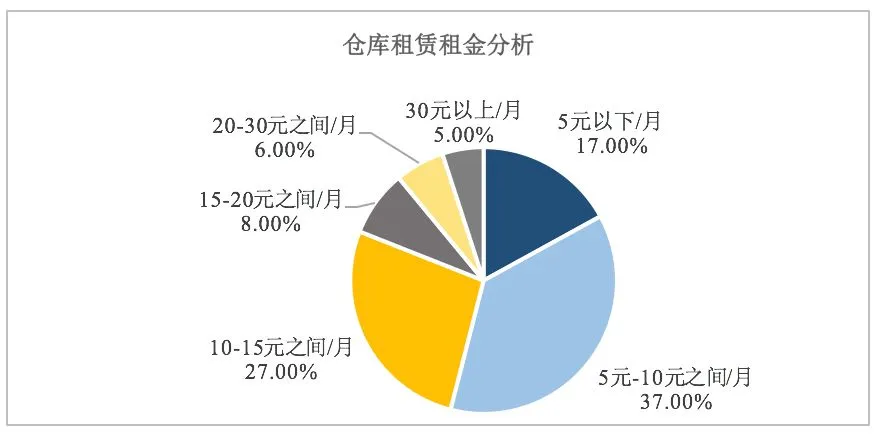 因不同地区、不同区位以及不同仓库设施配置的仓储,成本不尽相同,从《新经销》的问卷反馈数据来看:5元/m²-10元/m²每月是经销商主流的仓库租赁成本,约占37%,约有19%的经销商仓储单月成本超过15元/m²。