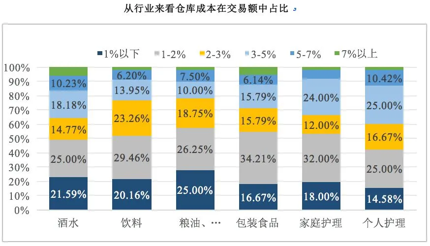 总体而言,销售规模越高,其仓储成本占总交易额越低。从不同品类看,家庭/个人护理品类的经销商相对数值较高,主要是因为品类的线下市场容量。其他品类整体数值虽有差异,但主要集中在1-3%。