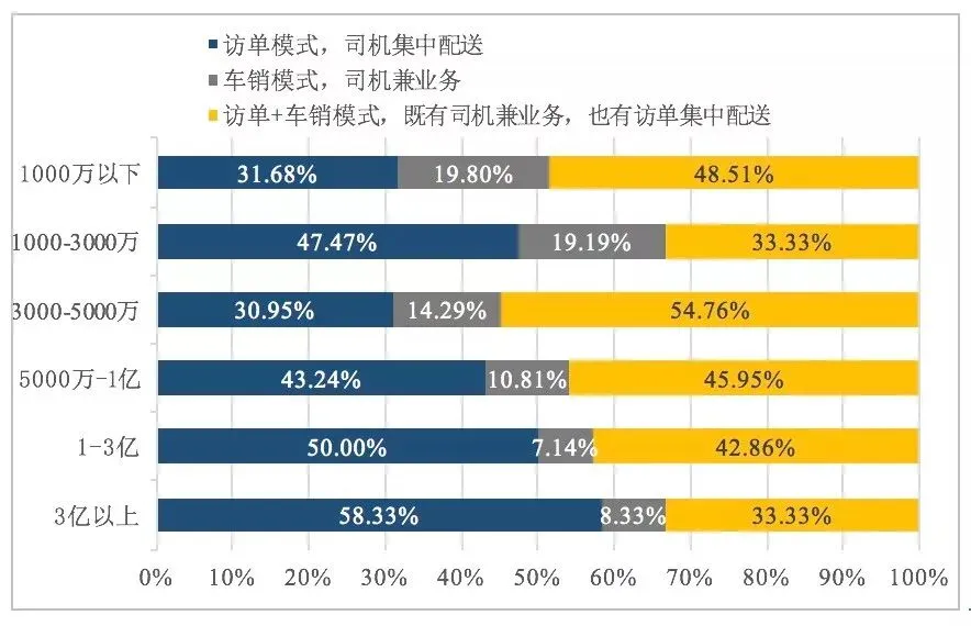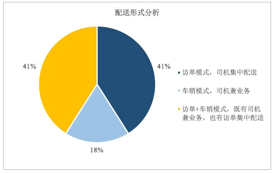 快消品经销商的仓配分销方式:访单+车销混合模式(两者各有优势,比如乡镇市场车销,城区市场访销)占比41%;访单模式占比41%;车销模式,司机兼业务配送占比18%。