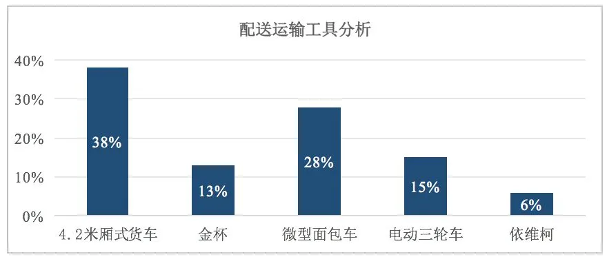 快消品经销商的配送工具:用4.2米厢式货车占比最高,占38%;其次分别为28%微型面包车;15%电动三轮车;13%金杯;6%依维柯。