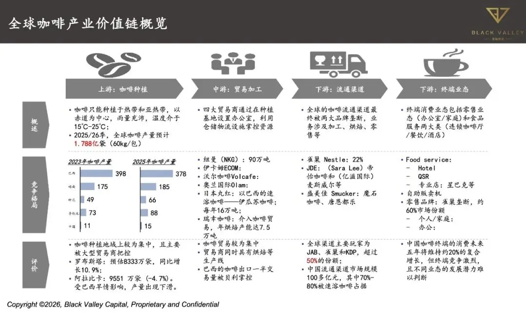 世界中餐业联合会联合黑峪投资,在2026年1月发布的《2025年咖啡产业报告》,把这场混战的内里门道扒得明明白白:胜负关键从不是门店数量的堆砌,而是供应链、消费场景、定价策略的三重博弈,最终推着整个行业转向新赛道。